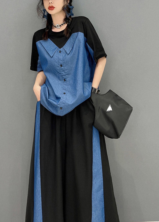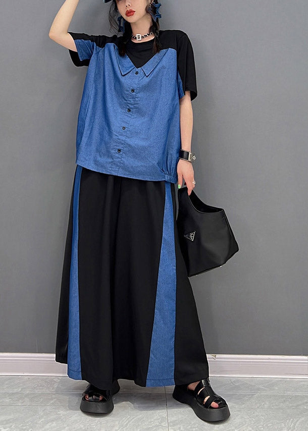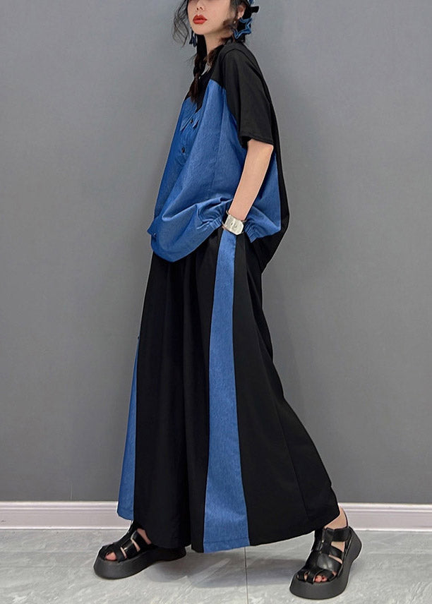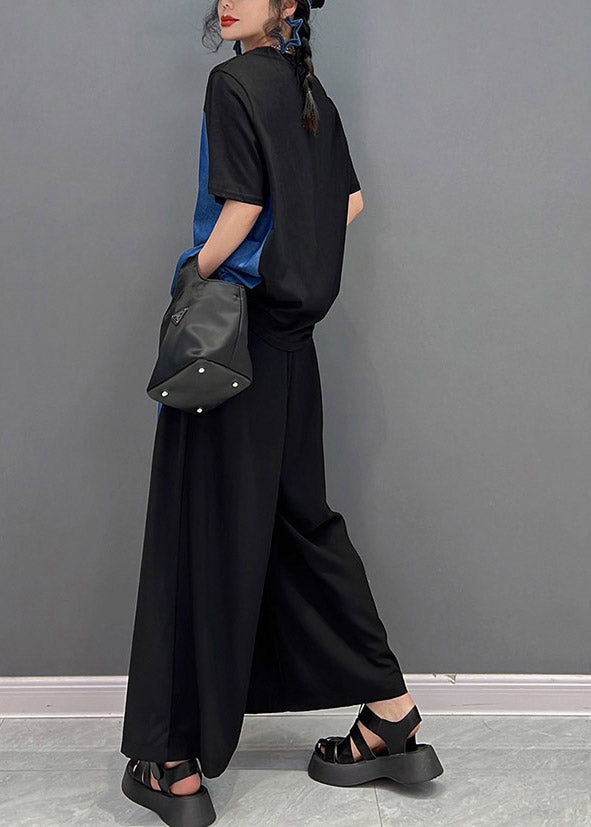 Boutique Black O-Neck Patchwork Top And Long Pants Two Piece Set Summer