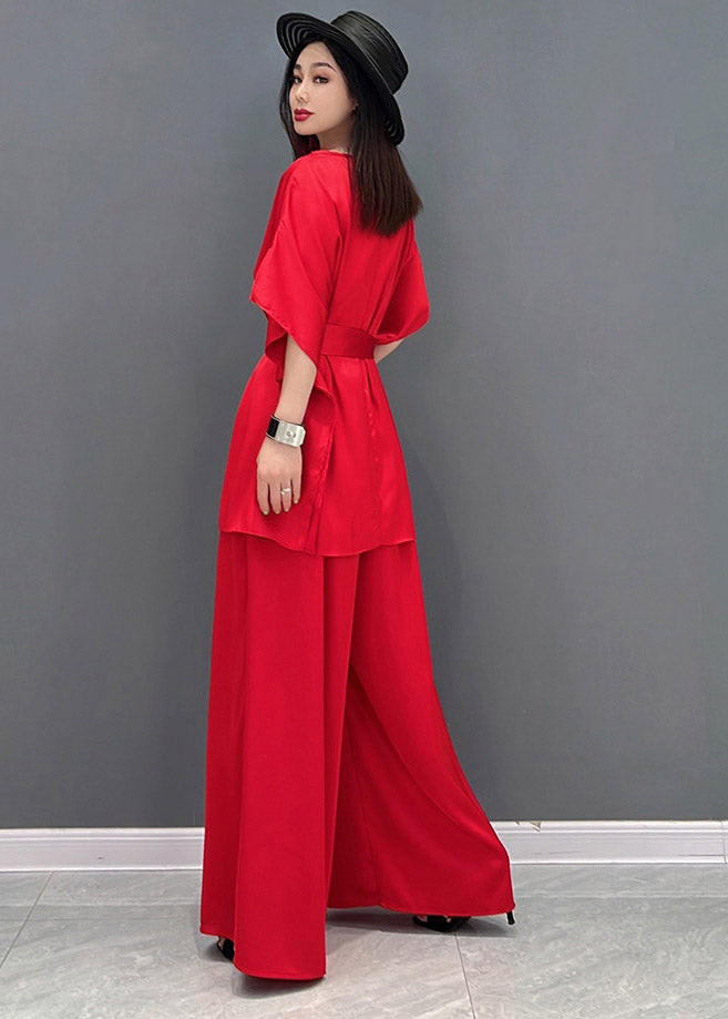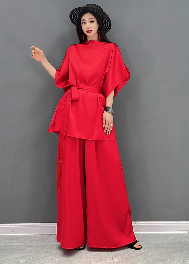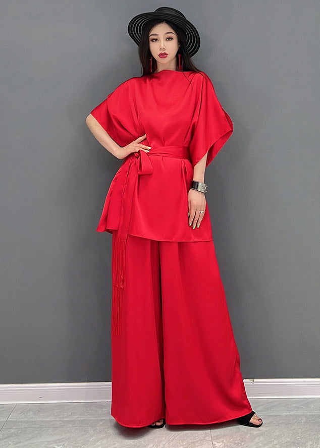 Fine Red Slash Neck Top And Long Pants Two Piece Set Summer