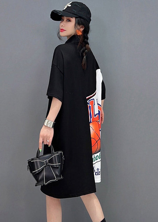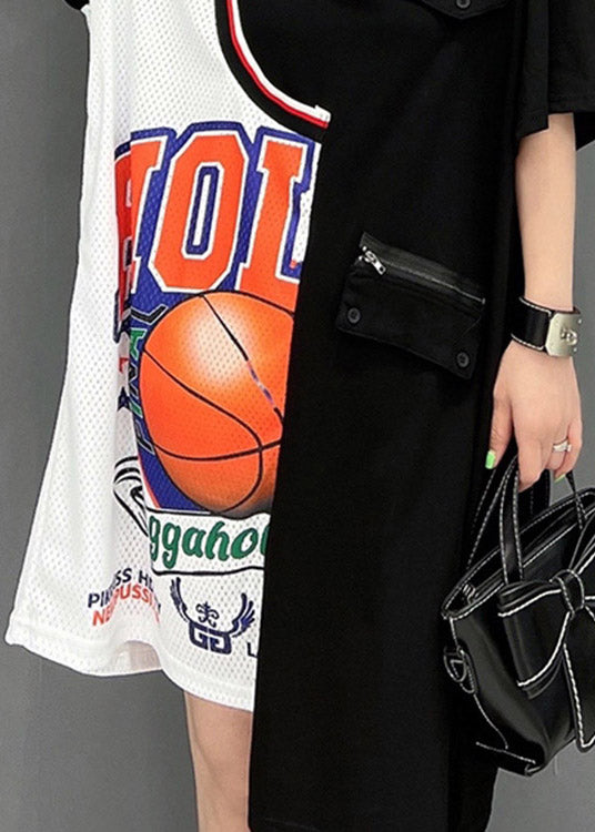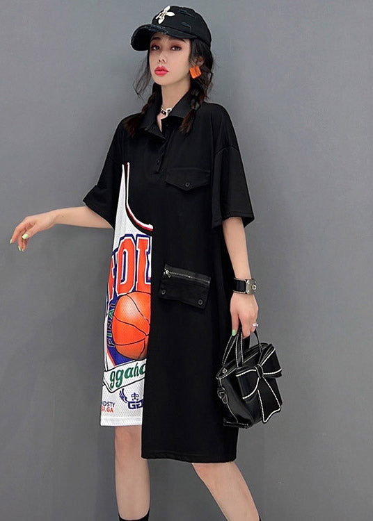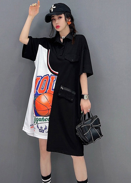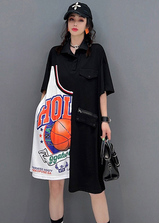 Loose Black Peter Pan Collar Print Asymmetrical Patchwork Zippered Pockets Shirt Short Sleeve