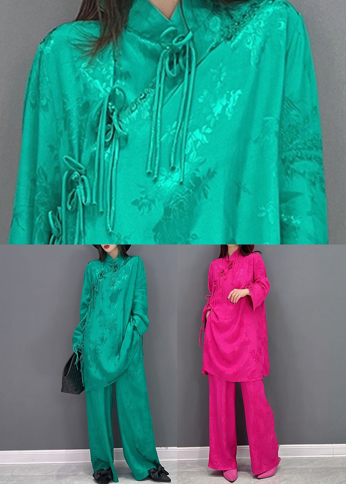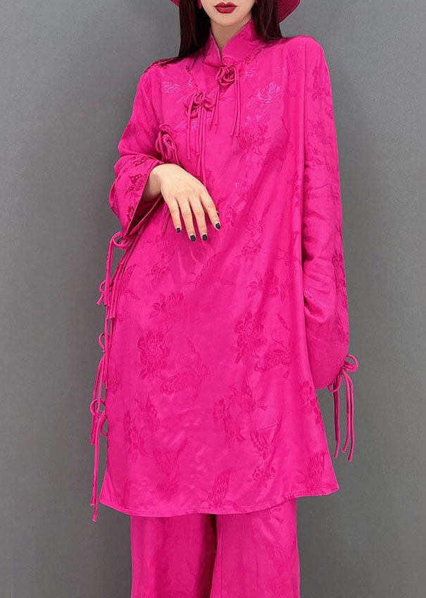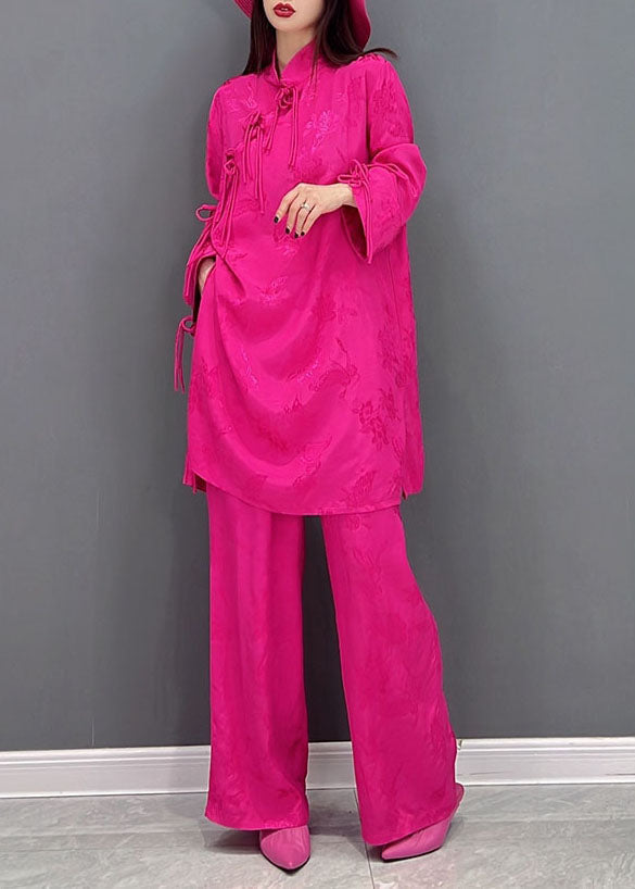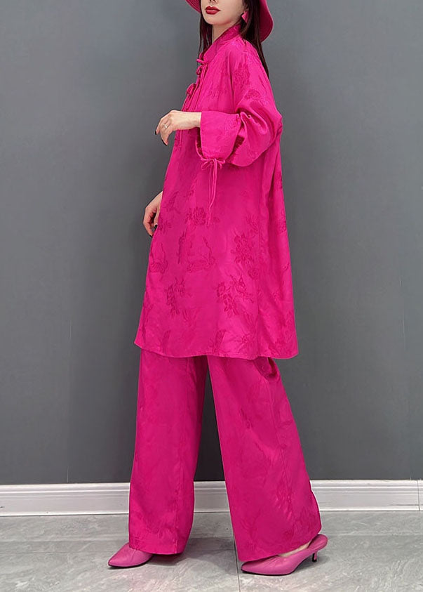 Rose Jacquard Silk Long Tops And Wide Leg Pants Two Pieces Set Stand Collar Long Sleeve