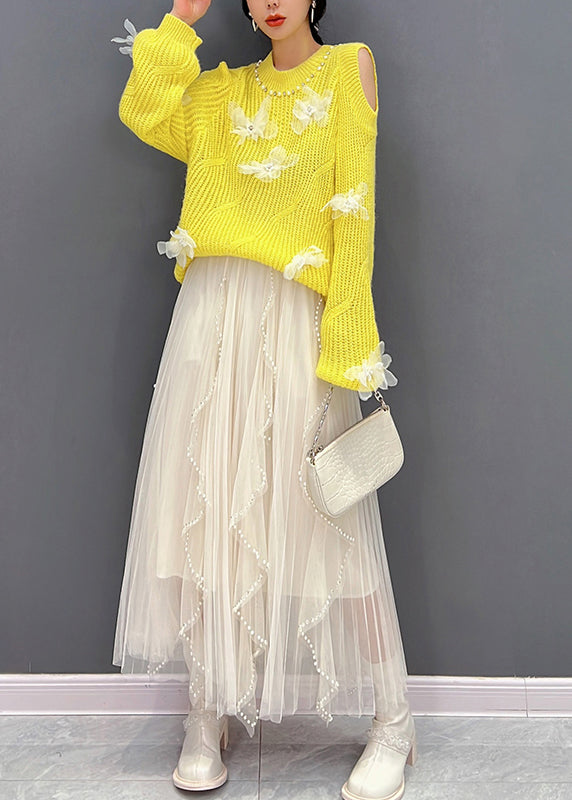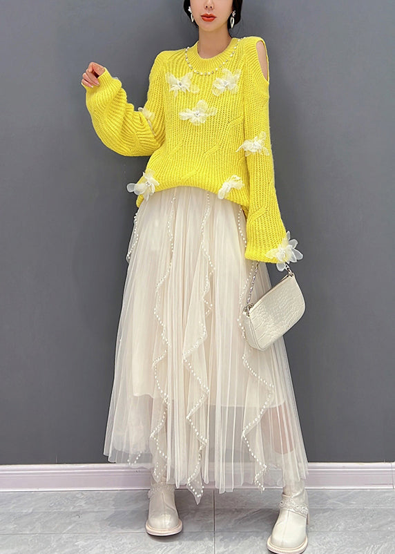 Yellow O-Neck Knit Top And Tulle Maxi Skirts Two Pieces Set Fall