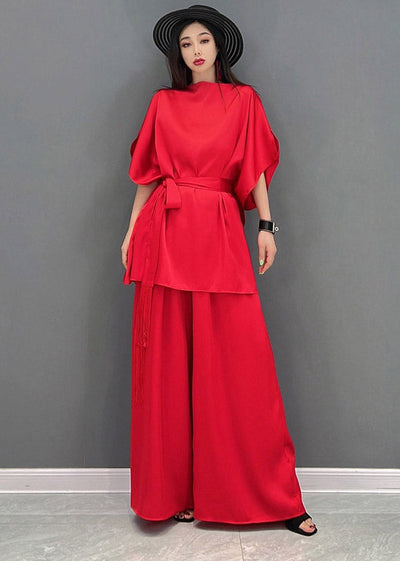 Fine Red Slash Neck Top And Long Pants Two Piece Set Summer