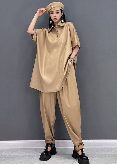 Vintage Khaki Peter Pan Collar Top And Pants Two Pieces Set Summer