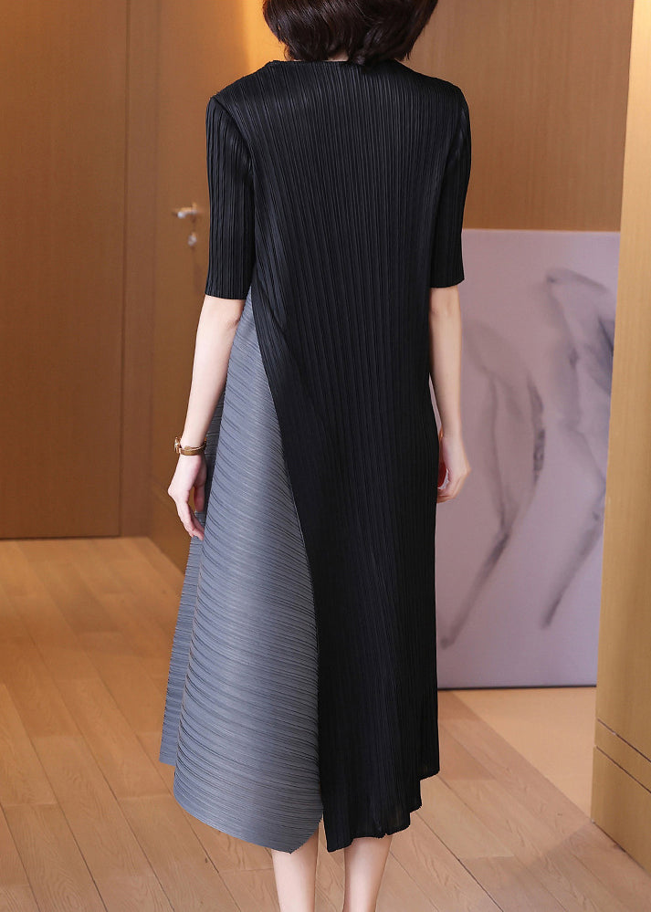 Elegant Black O-Neck Patchwork Wrinkled Vacation Dresses Short Sleeve