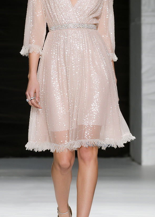 French Light Pink Sequins Tasseled Tulle Evening Dress Summer