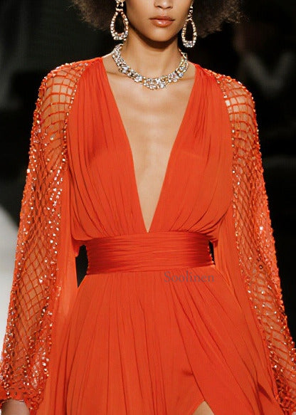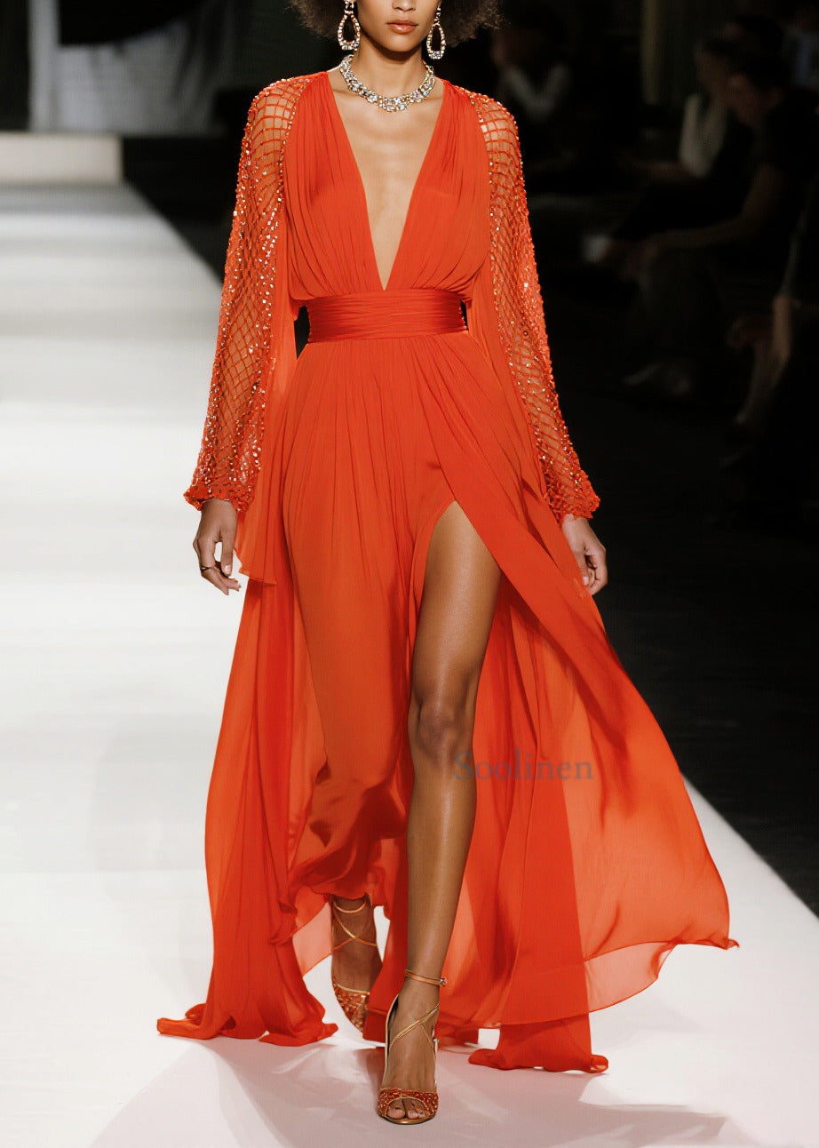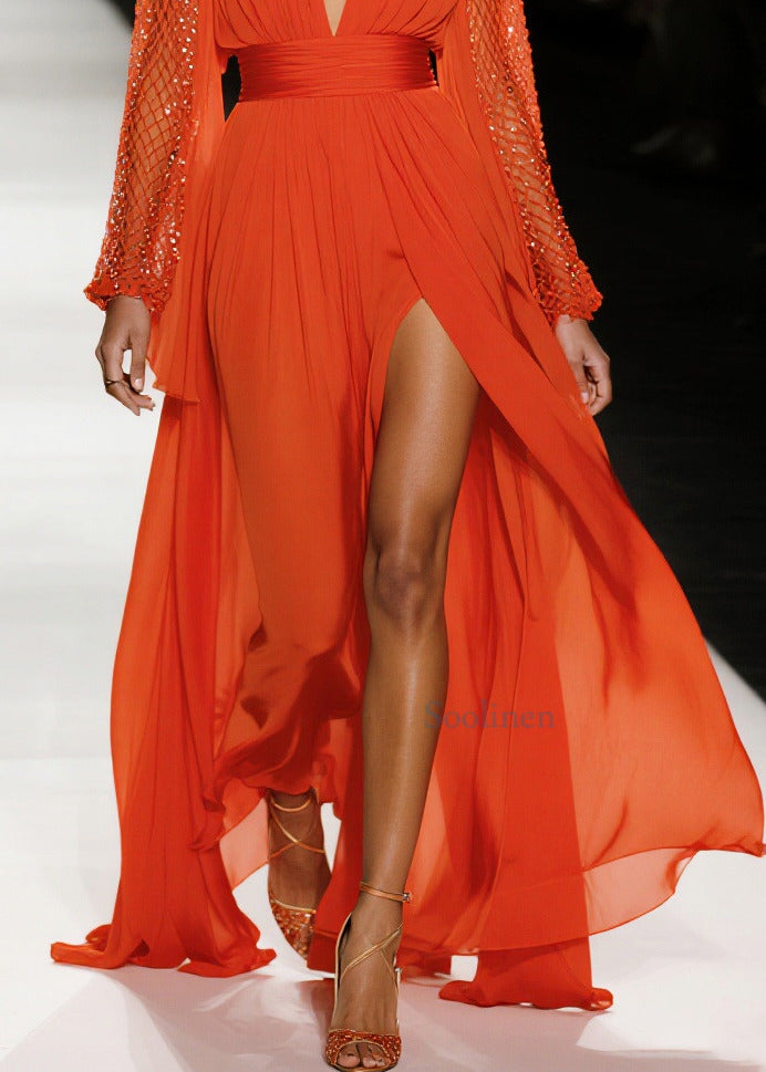 French Red Exra Large Hem Side Open Patchwork Mesh Chiffon Party Dresses Summer