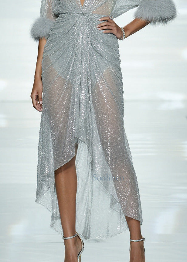Sexy Sky Blue Sequins Patchwork Faux Fur Tulle Sheer Dress Summer