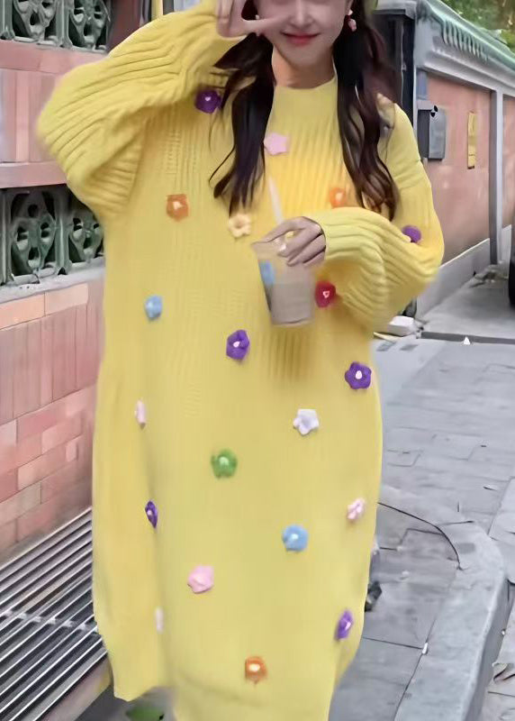 Stylish Pink O Neck Floral Long Knit Dress Winter