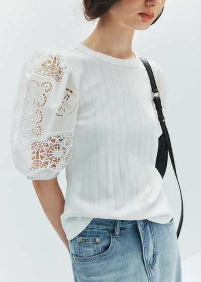 French White Hollow Out Embroidered Puff Sleeve Cotton Shirt