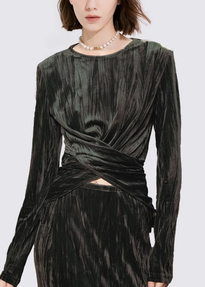 Slim Fit Grey O-Neck Wrinkled Silk Velour T Shirts Fall