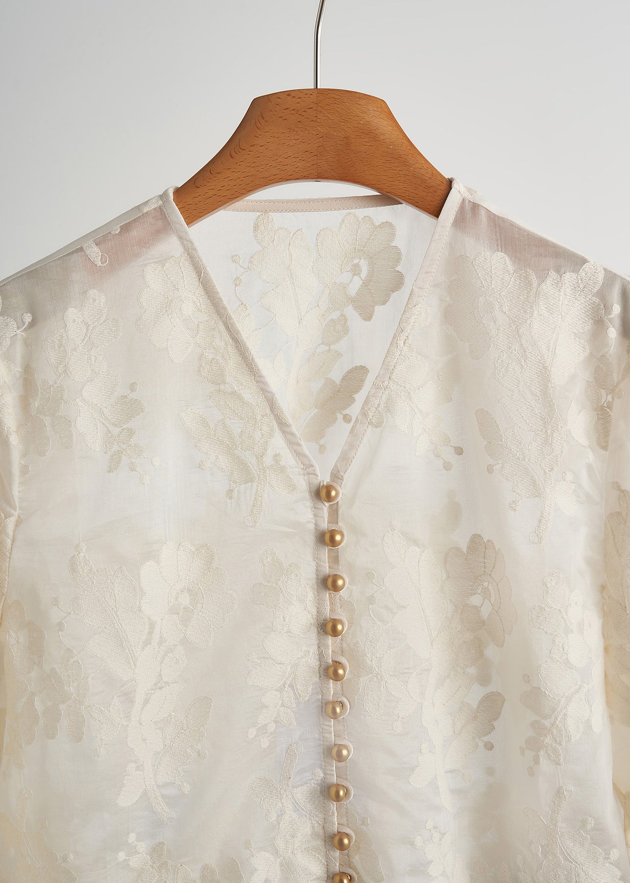 Chic White Jacquard Nail Bead Lace Tops Fall