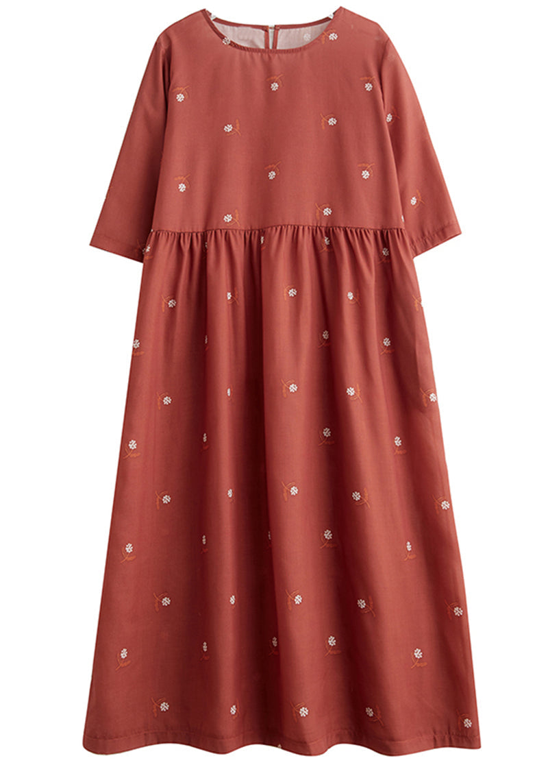 Women Brick Red Cinched Print Linen Dress Half Sleeve