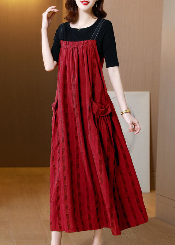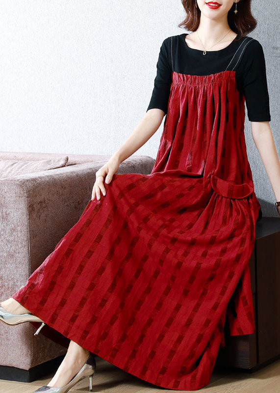 Women Red Striped Exra Large Hem Linen Strap Dress Two Pieces Set Summer