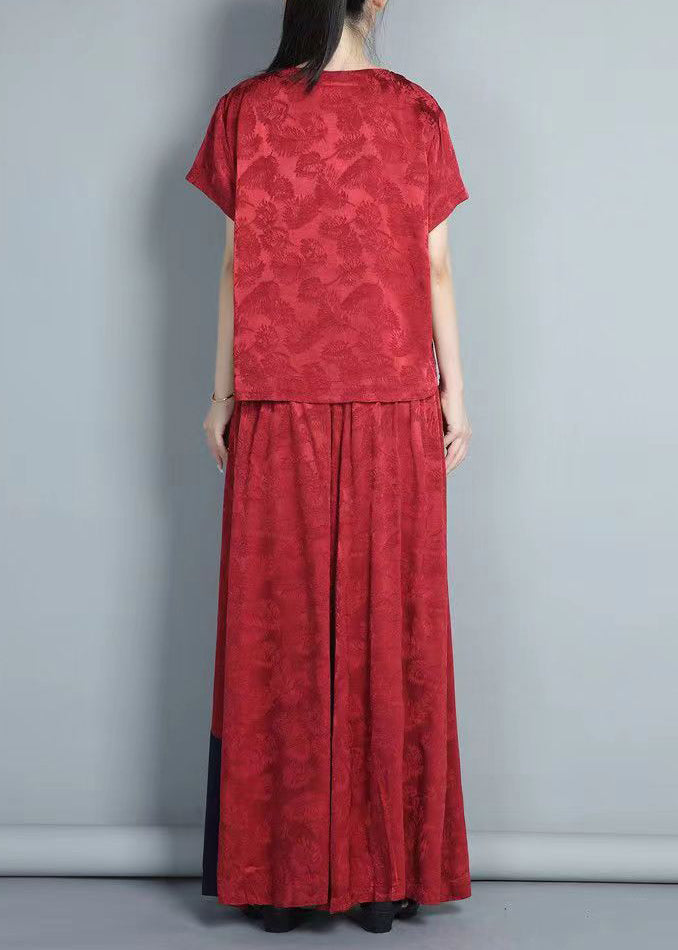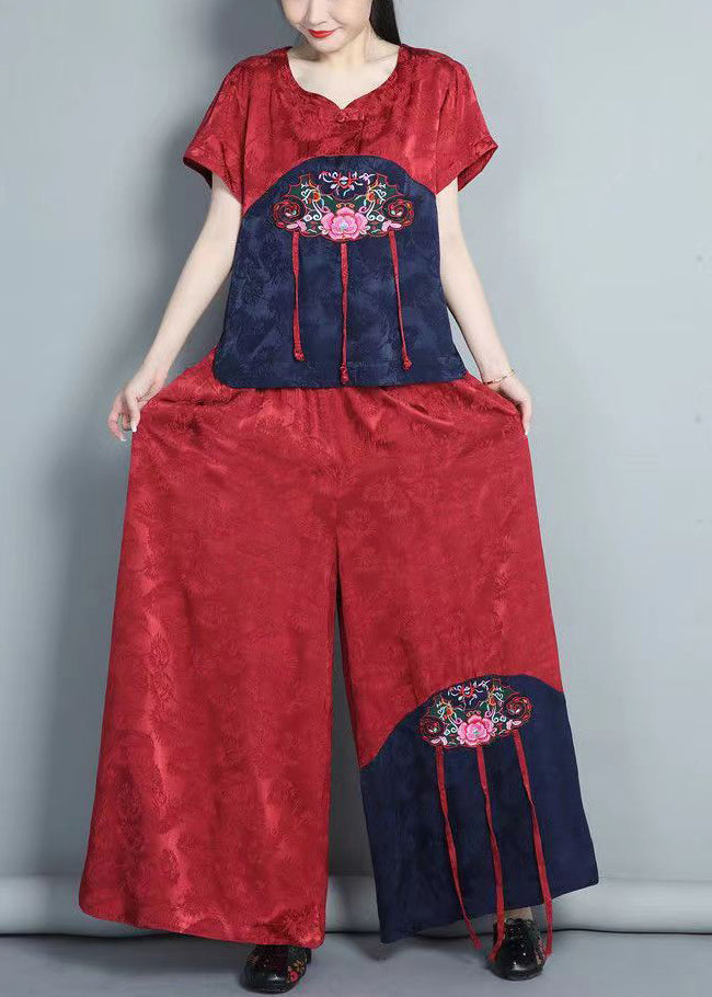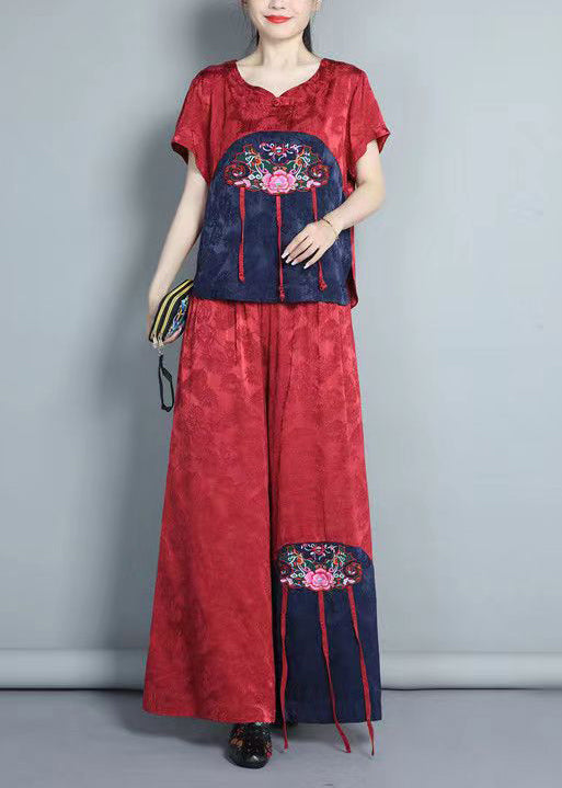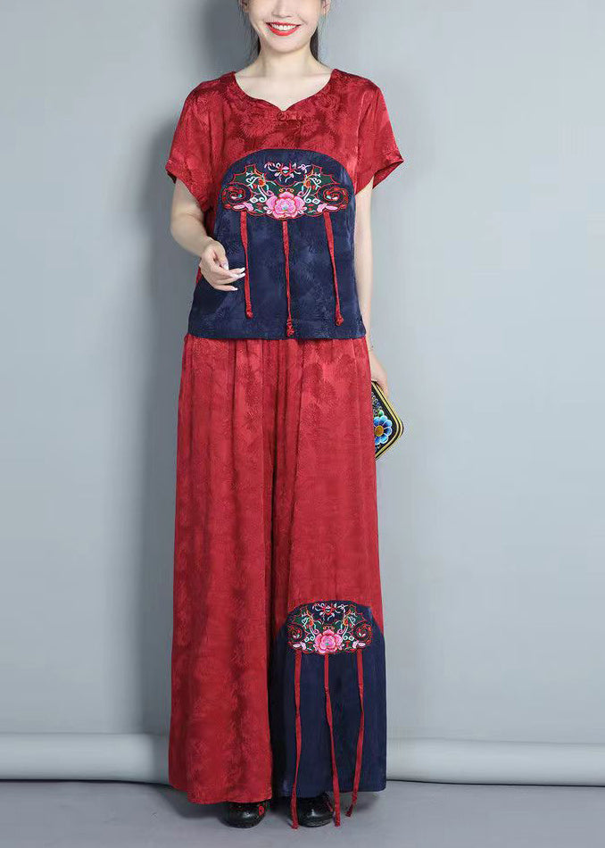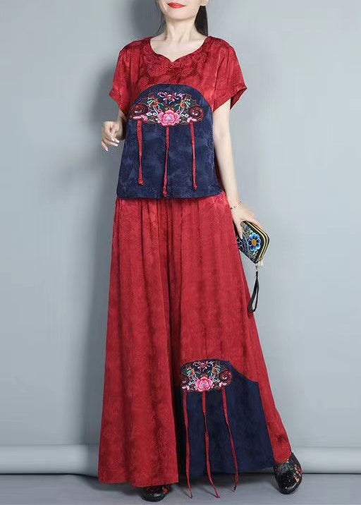 Boho Red Embroidered Tops And Pants Silk Two Piece Set Summer