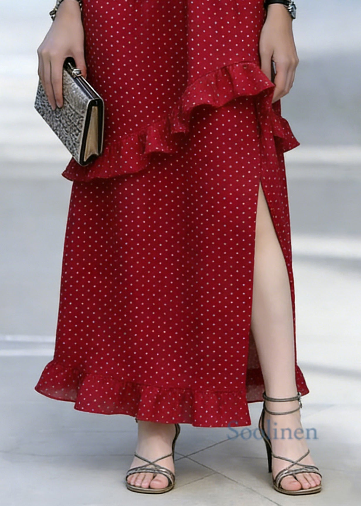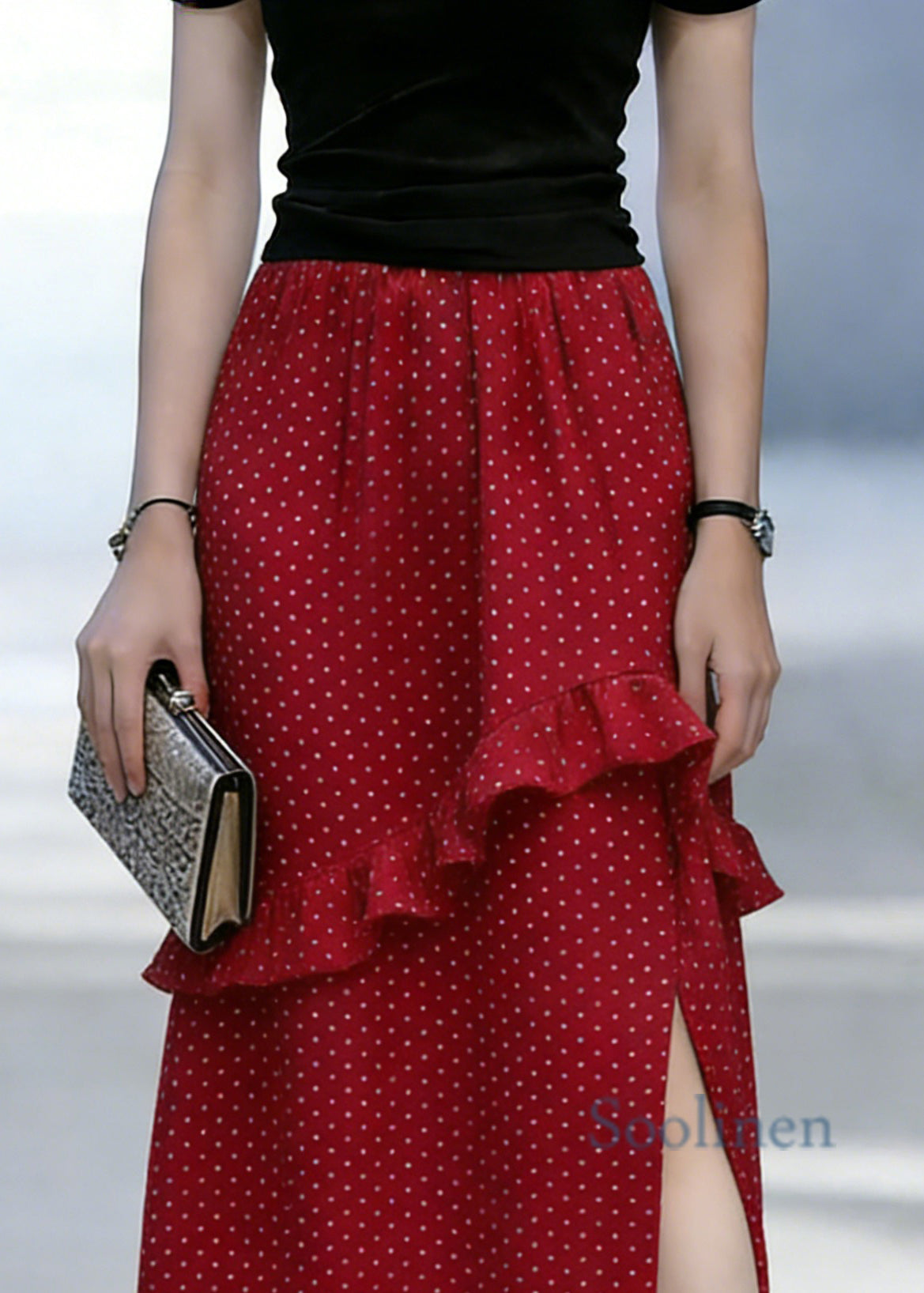Casual Red Dot Print Ruffled Side Open Chiffon Skirt