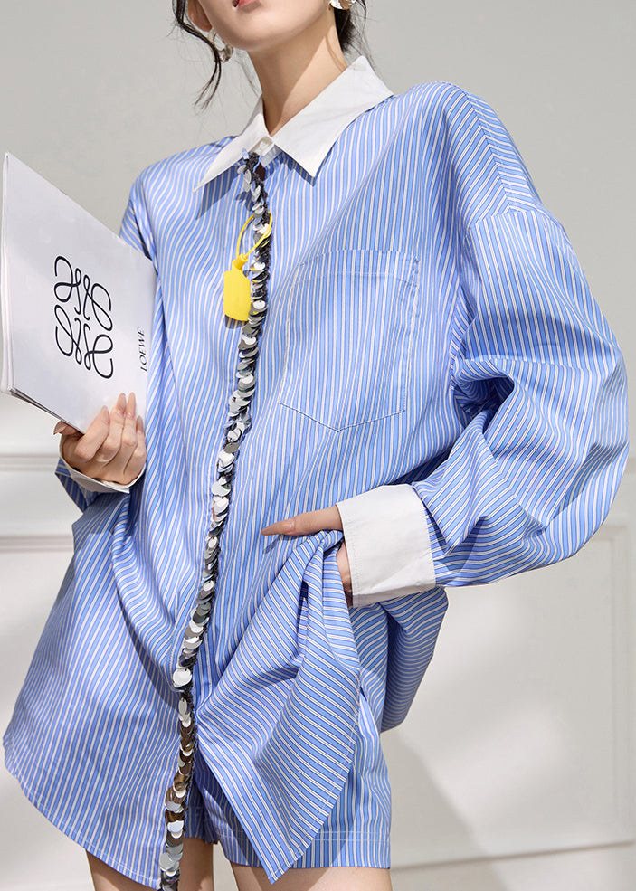 Striped Blue Peter Pan Collar Sequins Shirt And Shorts Cotton Two Pieces Set