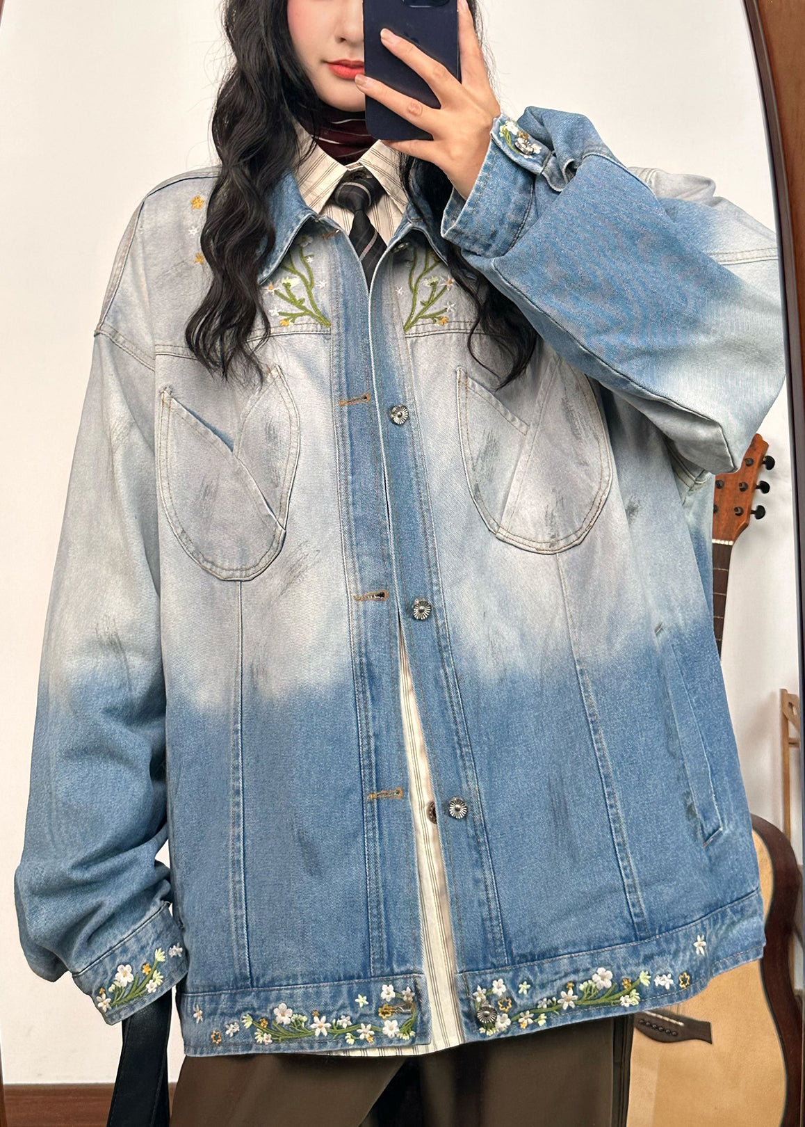 Plus Size Gradient Color Embroidered Pockets Denim Coats Fall