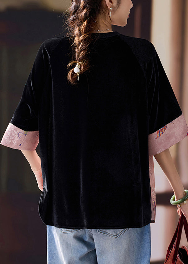 Vintage Pink Patchwork Cotton Oriental Tanks Butterfly Print Half Sleeve